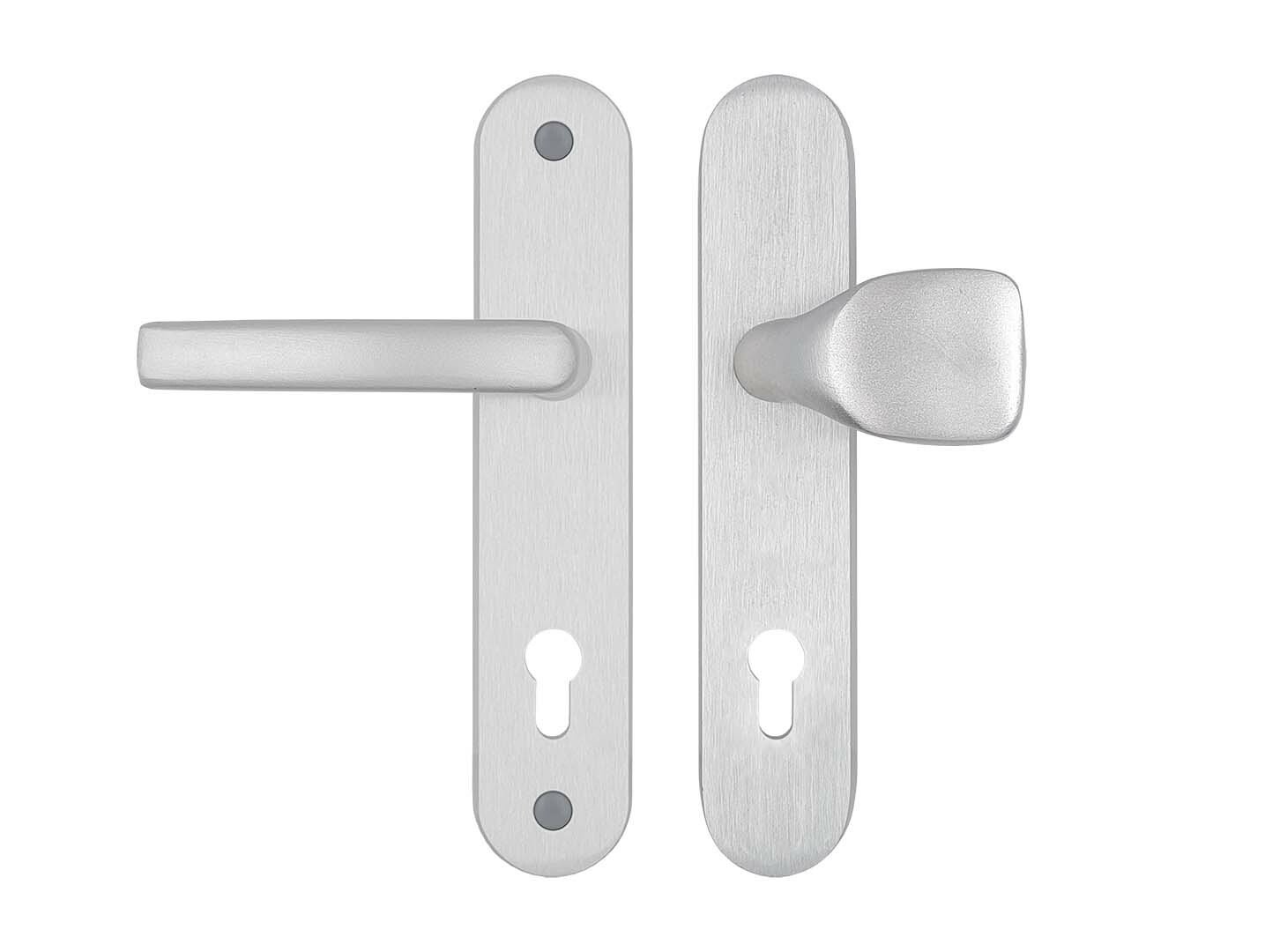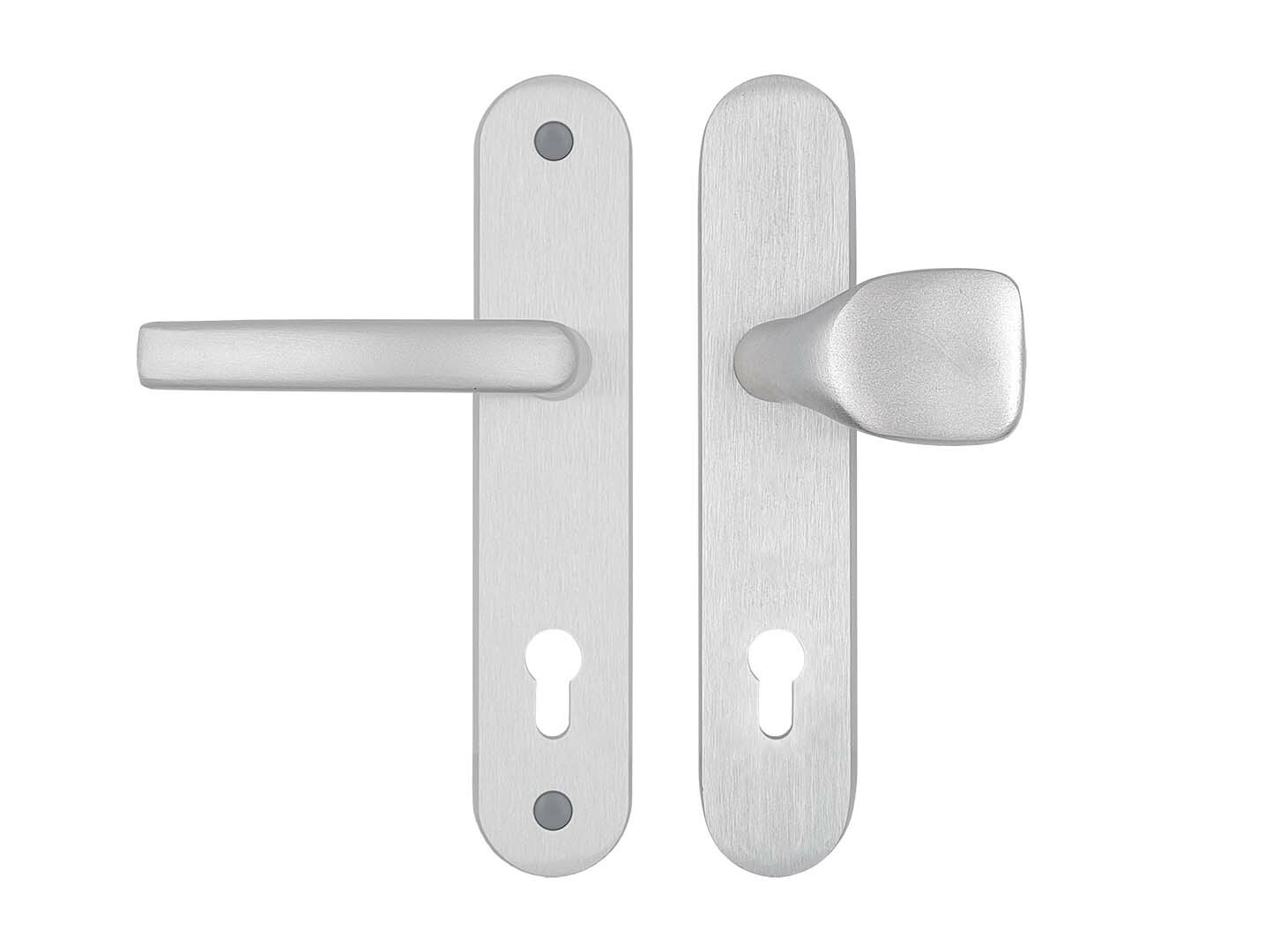 Štítová klika na vchodové a bezpečnostní dveře se zpevněným oválným štítem bez překrytí cylindrické vložky je vyrobena z hliníku a je povrchově upravena. Oválný štít má rozměry 50 mm x 248 mm a tloušťku 6 resp. 15 mm