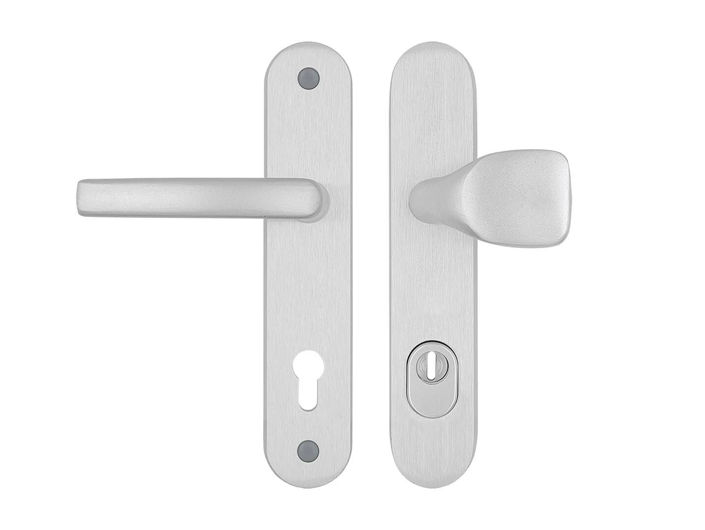 Štítová klika na vchodové a bezpečnostní dveře se zpevněným oválným štítem s překrytím cylindrické vložky je vyrobena z hliníku a je povrchově upravena. Oválný štít má rozměry 50 mm x 248 mm a tloušťku 6 resp. 15 mm.