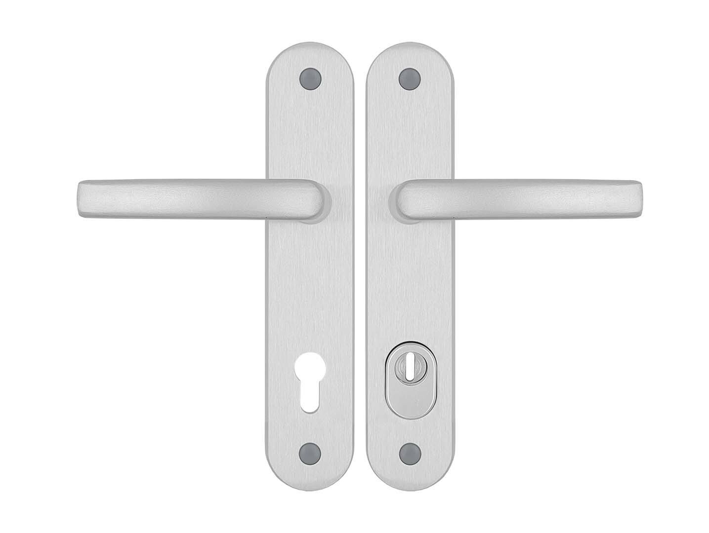 Štítová klika na vchodové a bezpečnostní dveře se zpevněným oválným štítem s překrytím cylindrické vložky je vyrobena z hliníku a je povrchově upravena. Oválný štít má rozměry 50 mm x 248 mm a tloušťku 6 resp. 15 mm.