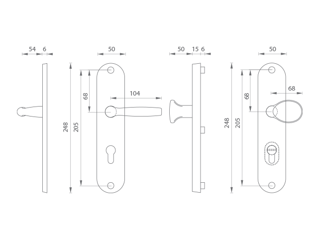 Štítová klika na vchodové a bezpečnostní dveře se zpevněným oválným štítem s překrytím cylindrické vložky je vyrobena z hliníku a je povrchově upravena. Oválný štít má rozměry 50 mm x 248 mm a tloušťku 6 resp. 15 mm.