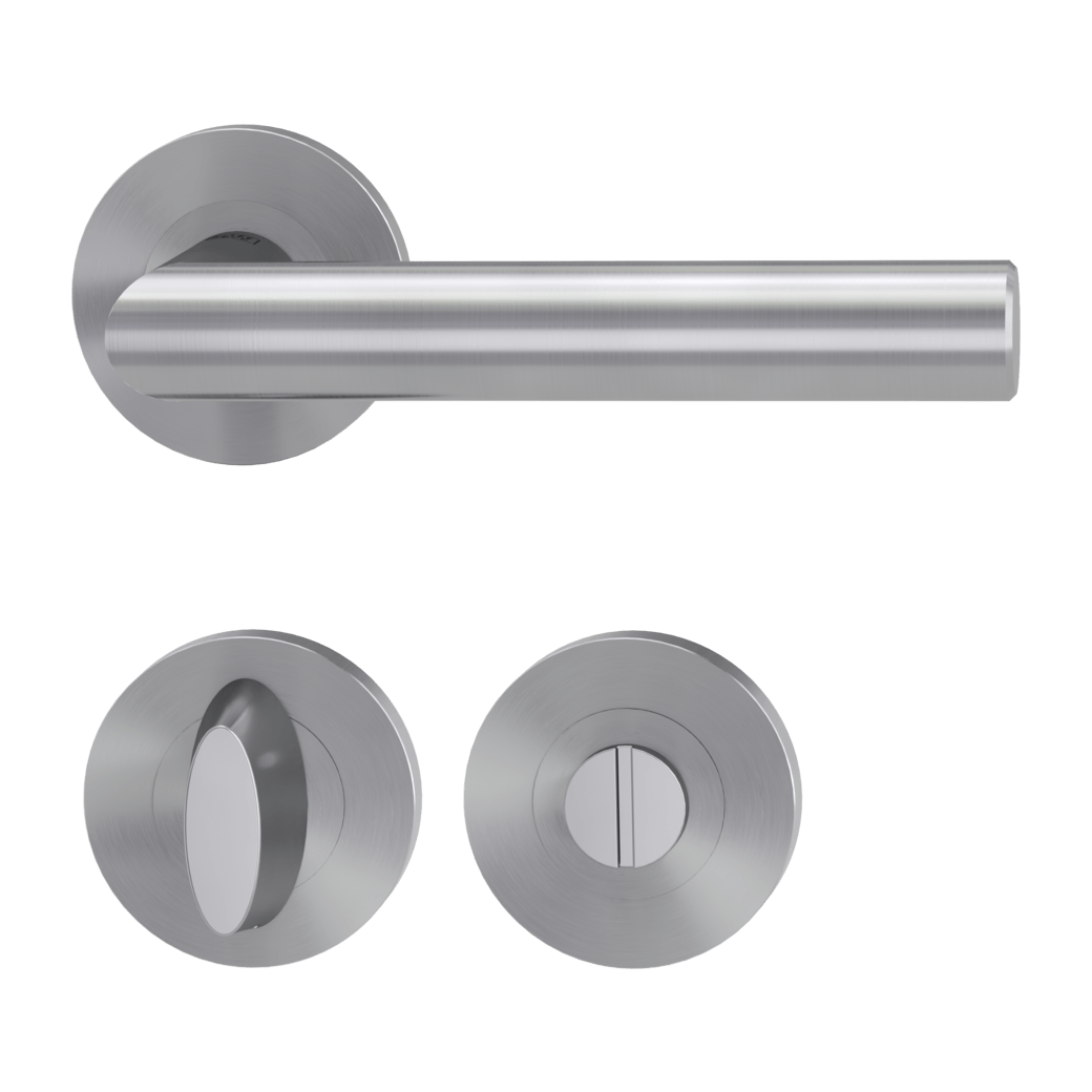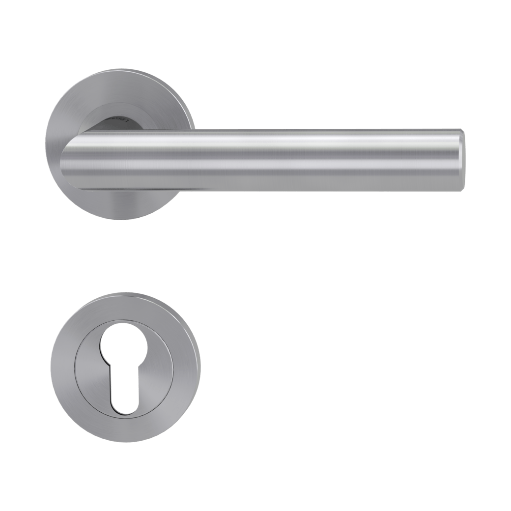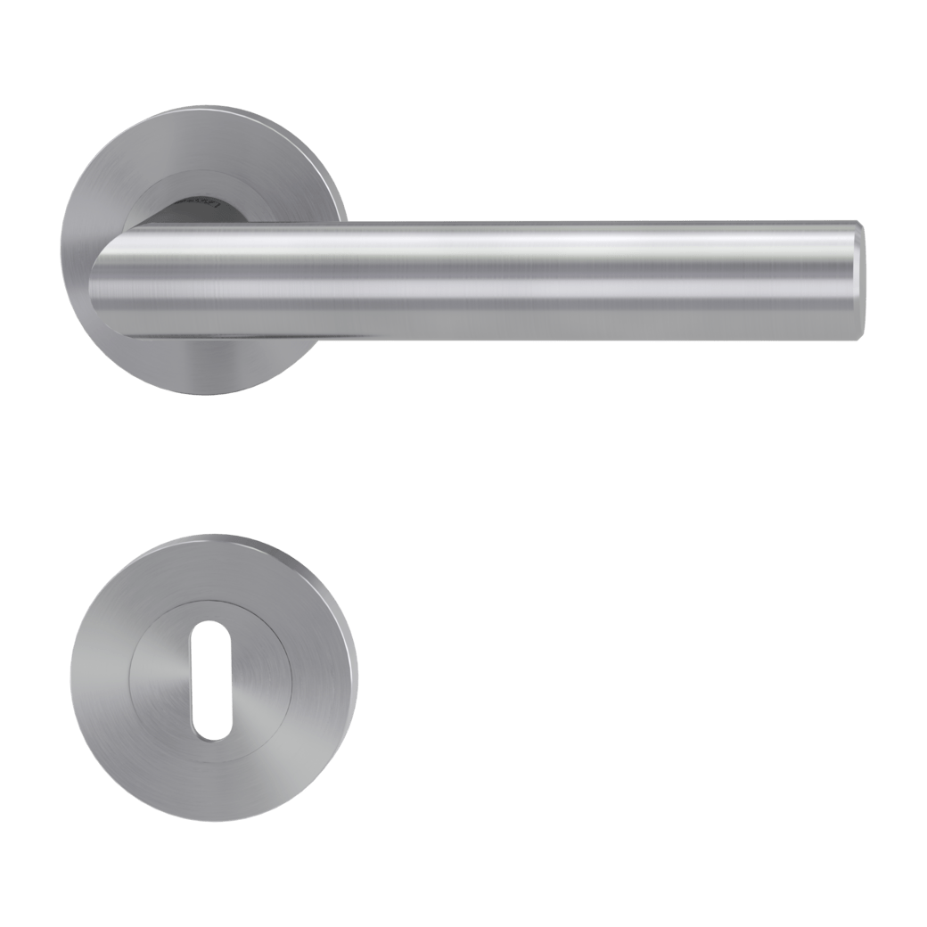 Rozetová klika na interiérové ​​dveře s kulatou rozetou je vyrobena z vysoce kvalitní nerezavějící oceli, známé jako nerez a je povrchově upravena. Rozeta má průměr 53 mm a tloušťku 8 mm.
