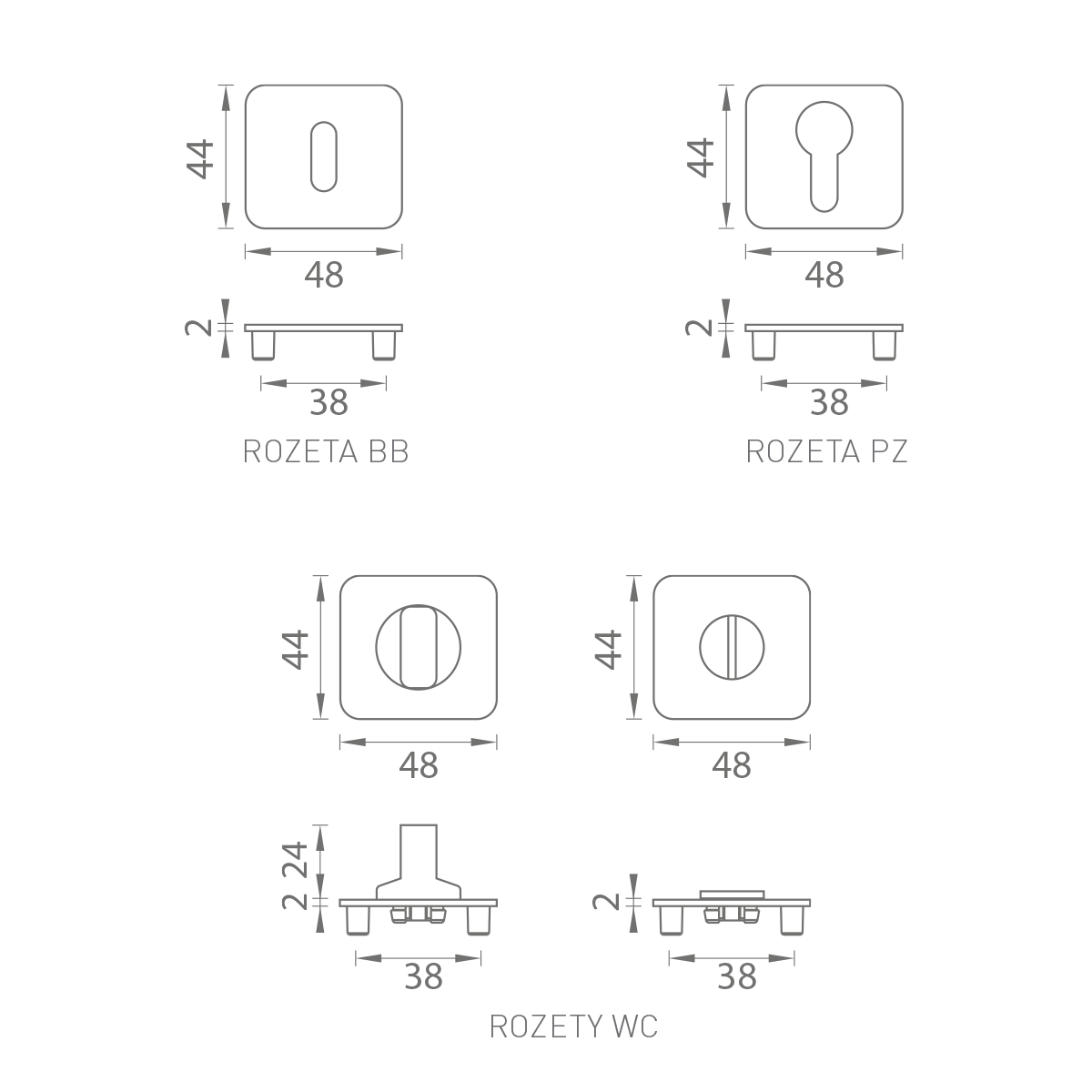 Rozeta má rozměry 48 mm x 44 mm, tloušťku 2 mm a oválný otvor pro interiérový klíč (BB), otvor pro cylindrickou vložku (PZ) anebo WC set s vmontovaným klíčem.