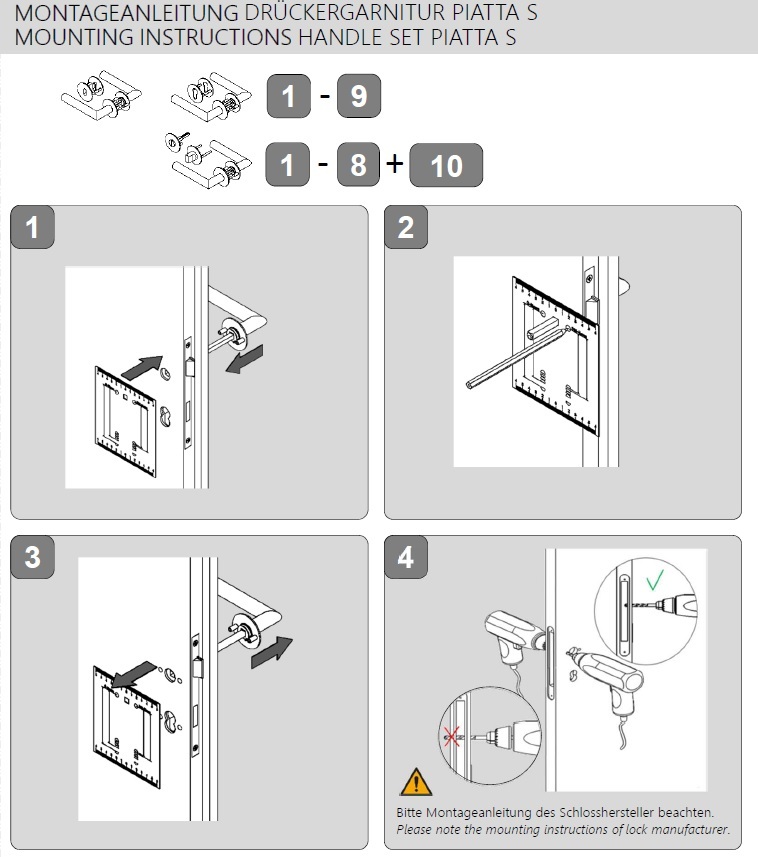 Standardně je kování dodáváno se šrouby a čtyřhranem (8x8 mm) pro tloušťku dveří 38 - 45 mm.