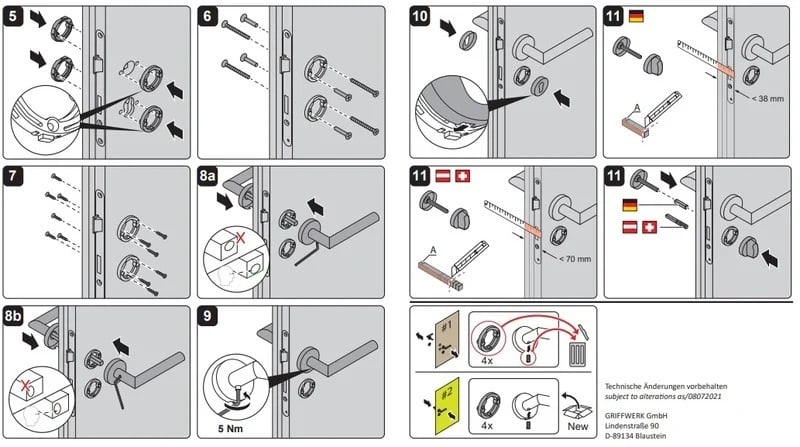Standardně je kování dodávané se šrouby a čtyřhranem (8 x 8 mm) pro tloušťku dveří 38 - 45 mm.