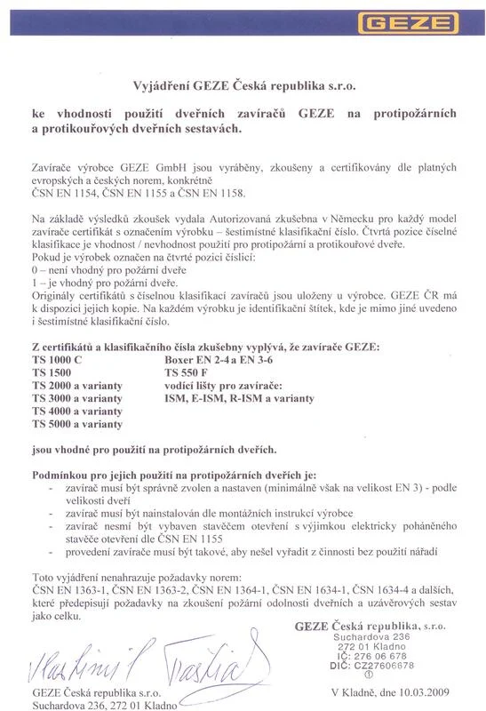 Síla zavírání velikosti 1 dle ČSN EN 1154 - je pro šířku dveřního křídla do 750 mm, nesmí být nastavena na protipožárních dveřích