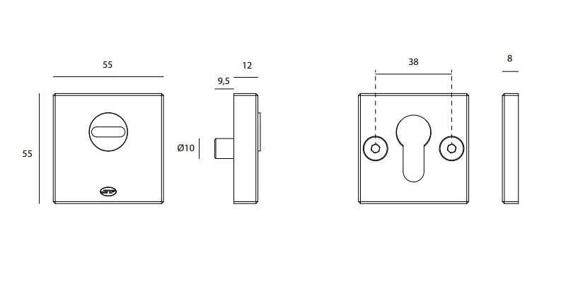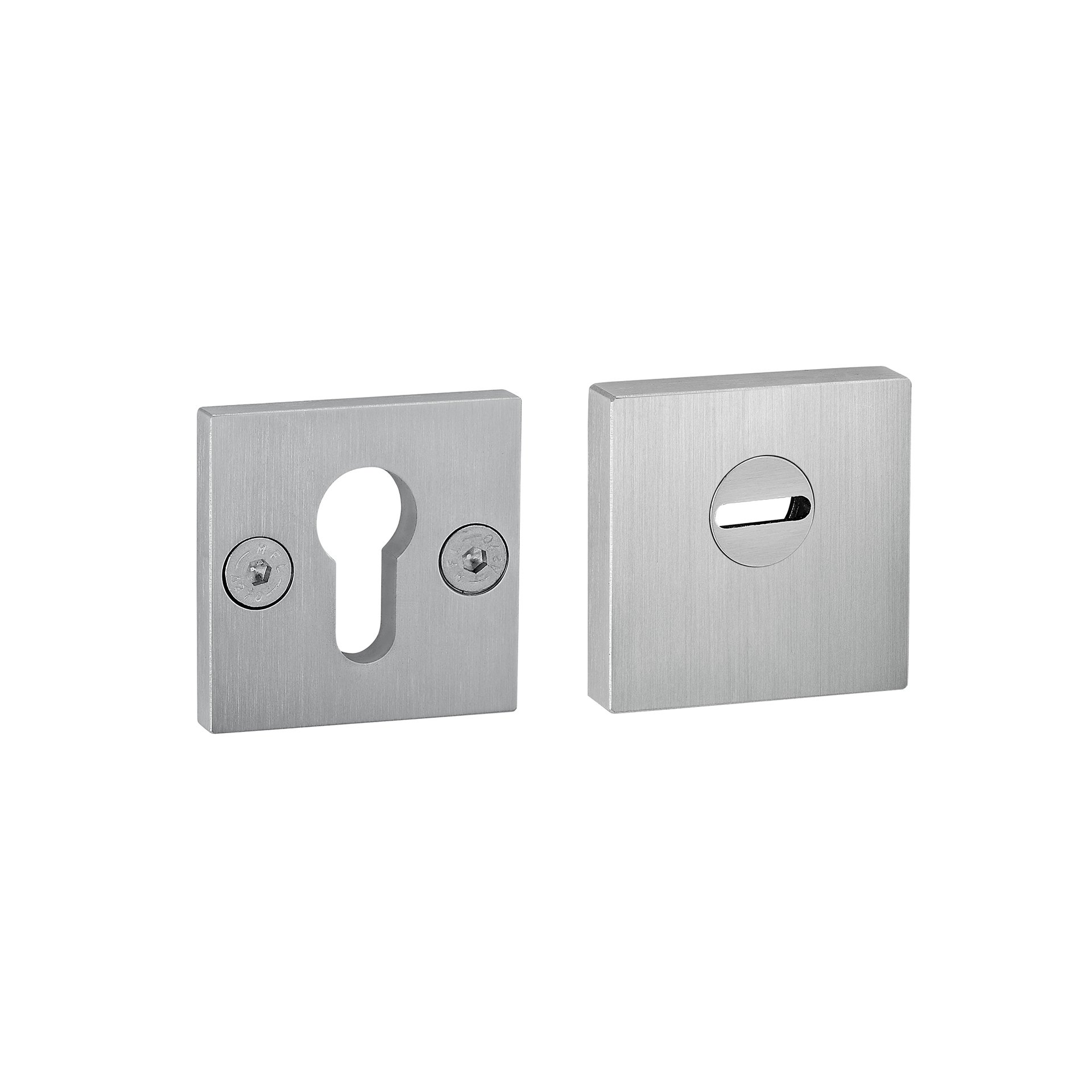 Bezpečnostní hranatá rozeta s překrytím cylindrické vložky je vyrobena z nerezavějící oceli a a je povrchově upravena.