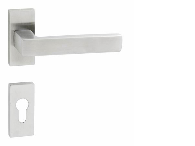 Rozetová klika na interiérové dveře s hranatou úzkou rozetou je vyrobena z vysoce kvalitní nerezavějící oceli, známé jako nerez a je povrchově upravena.