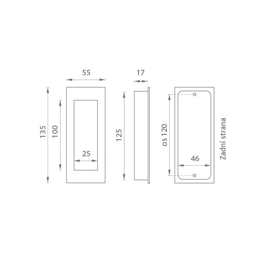 Hranatá mušle je vyrobena z vysoce kvalitní nerezavějící oceli, známé jako nerez a je povrchově upravena. Mušle má výšku 135 mm, šířku 55 mm, zádlab 17 mm a celkovou tloušťku 19 mm. Krytka s pružinou. Montáž mušle lepením. Cena je uvedena za kus.