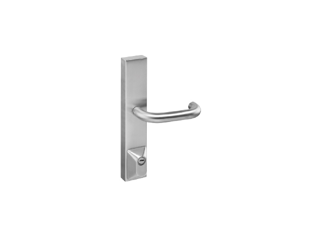 Panikové kování pro jednokřídlové dveře s jednobodovým zajištěním. Zavírání přes boční ocelovou západku. Otvírání pomocí klíče a kliky. Štítová nerezová klika a cylindrická vložka jsou součástí balení.