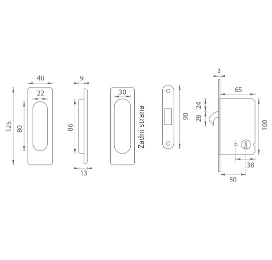 Hranatý set na posuvné dveře s otvorem pro interiérový klíč (BB).