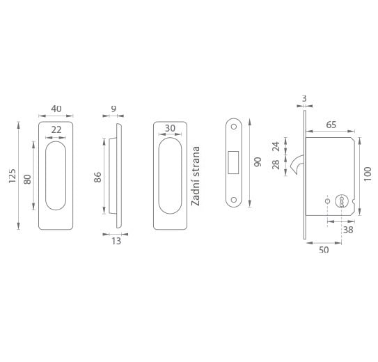 Hranatý set na posuvné dveře s otvorem pro interiérový klíč (BB).