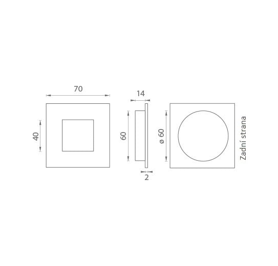 Zapuštěná hranatá mušle je vyrobena z vysoce kvalitní nerezavějící oceli, známé jako nerez a je povrchově upravena. Mušle má výšku 70 mm, šířku 70 mm, zádlab 14 mm a celkovou tloušťku 16 mm. Montáž mušle lepením. Cena je uvedena za kus.
