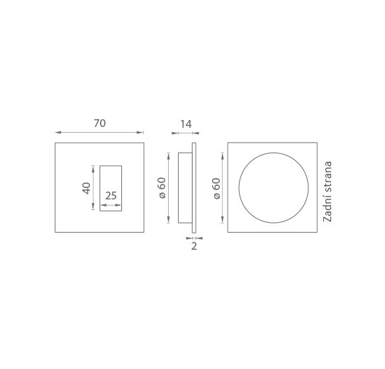 Zapuštěná hranatá mušle je vyrobena z vysoce kvalitní nerezavějící oceli, známé jako nerez a je povrchově upravena. Mušle má výšku 70 mm, šířku 70 mm, zádlab 14 mm a celkovou tloušťku 16 mm. Montáž mušle lepením. Cena je uvedena za kus.