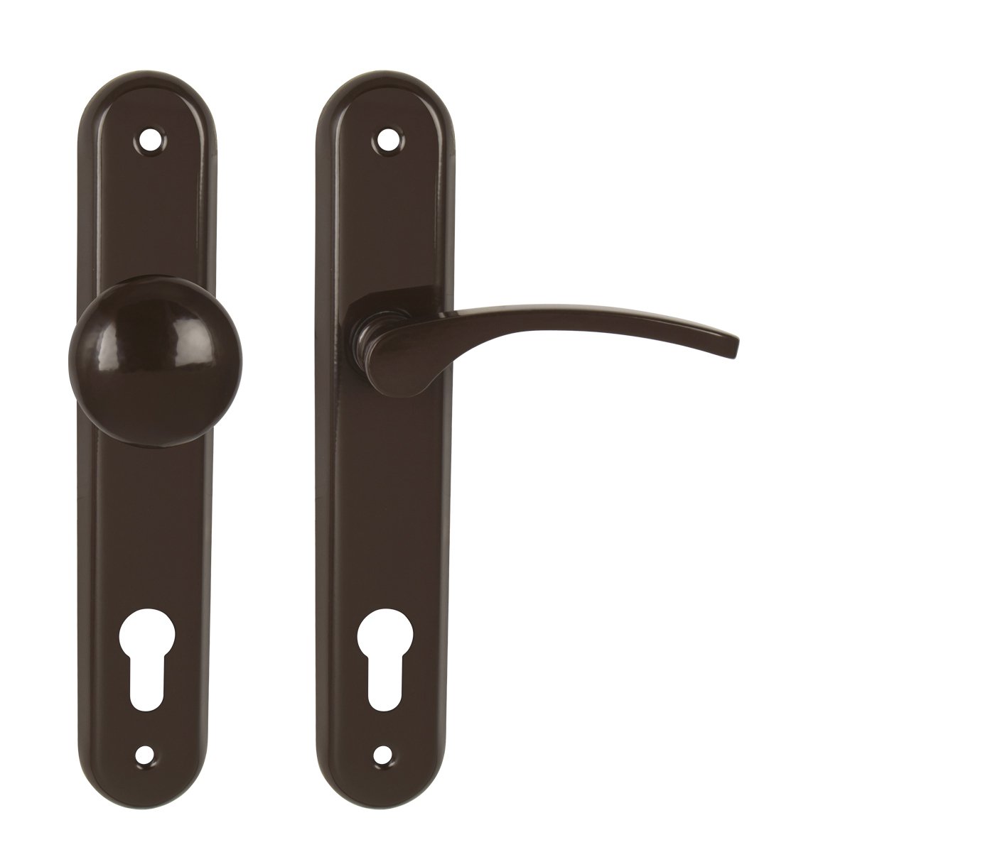 Štítová klika na interiérové ​​dveře s oválným štítem je vyrobena z hliníku a je povrchově upravena. Oválný štít má rozměry 42 mm x 230 mm a klika neobsahuje vratný mechanismus.