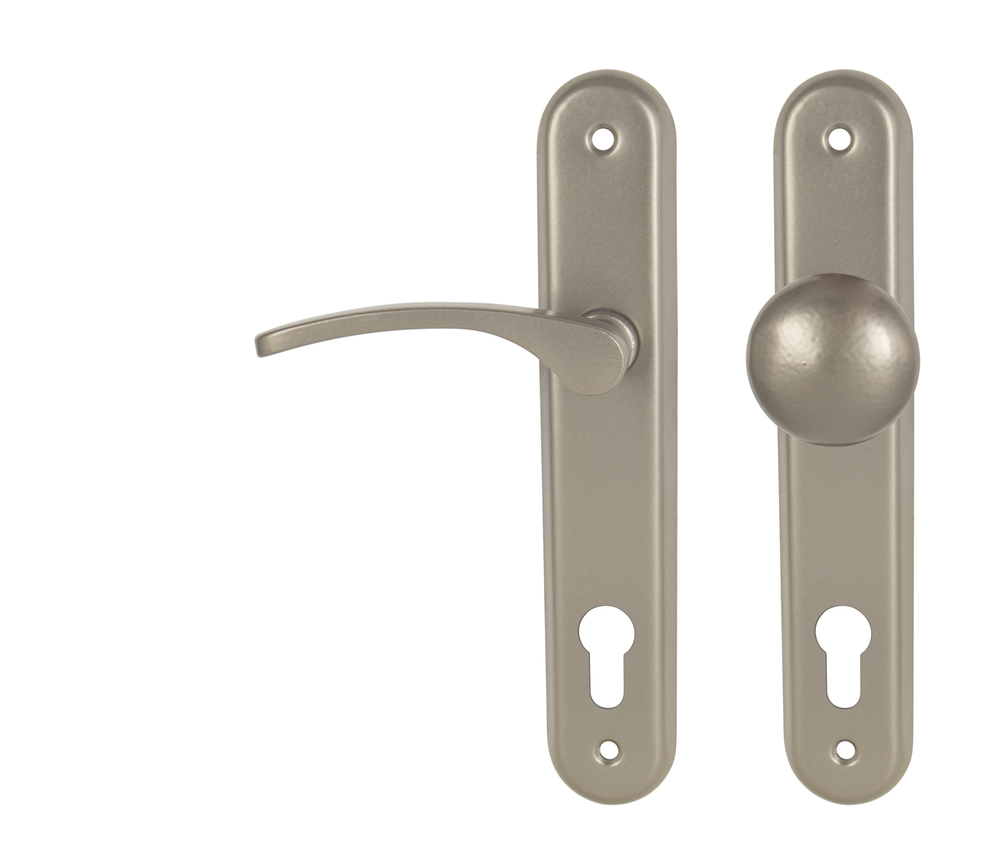 Štítová klika na interiérové ​​dveře s oválným štítem je vyrobena z hliníku a je povrchově upravena. Oválný štít má rozměry 42 mm x 230 mm a klika neobsahuje vratný mechanismus.