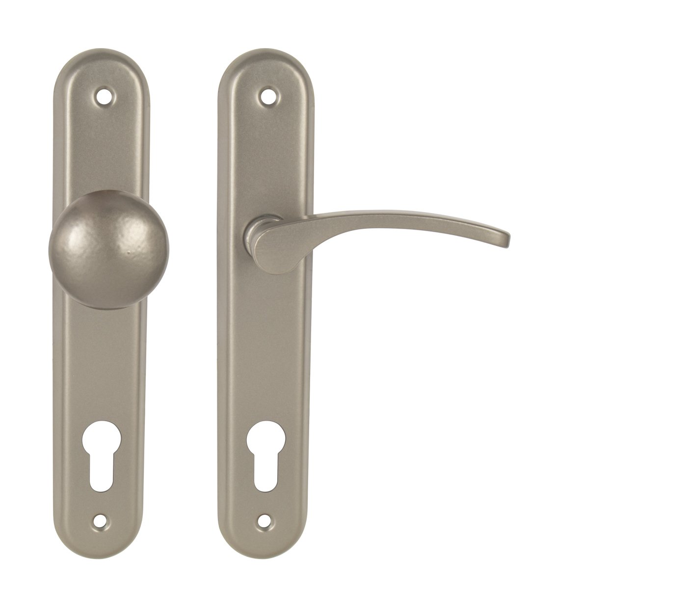 Štítová klika na interiérové ​​dveře s oválným štítem je vyrobena z hliníku a je povrchově upravena. Oválný štít má rozměry 42 mm x 230 mm a klika neobsahuje vratný mechanismus.