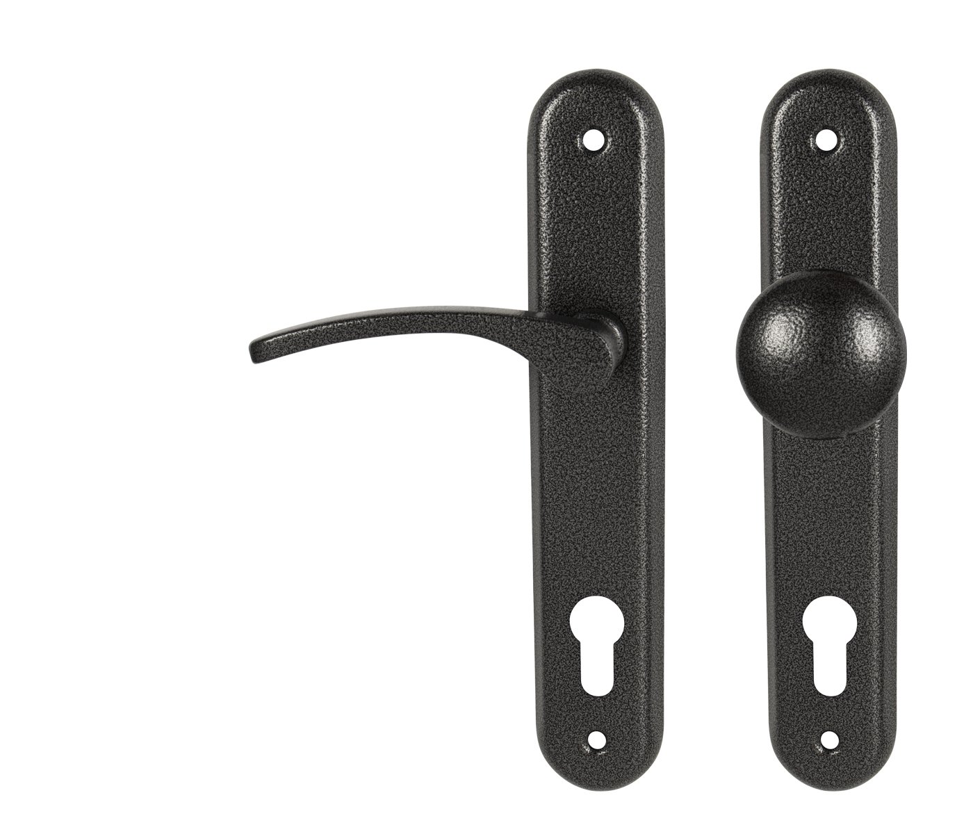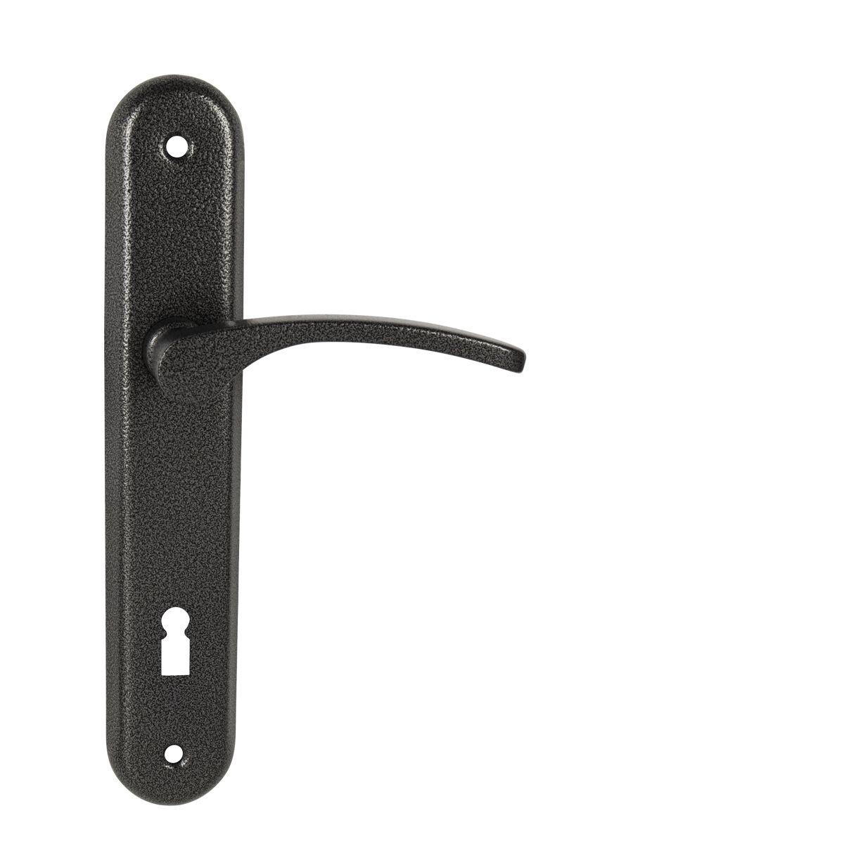 Štítová klika na interiérové ​​dveře s oválným štítem je vyrobena z hliníku a je povrchově upravena. Oválný štít má rozměry 42 mm x 230 mm a klika neobsahuje vratný mechanismus.