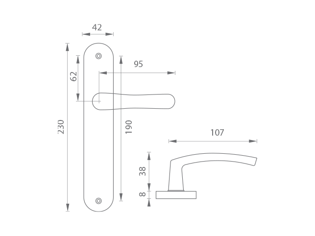 Štítová klika na interiérové ​​dveře s oválným štítem je vyrobena z hliníku a je povrchově upravena. Oválný štít má rozměry 42 mm x 230 mm a klika neobsahuje vratný mechanismus.