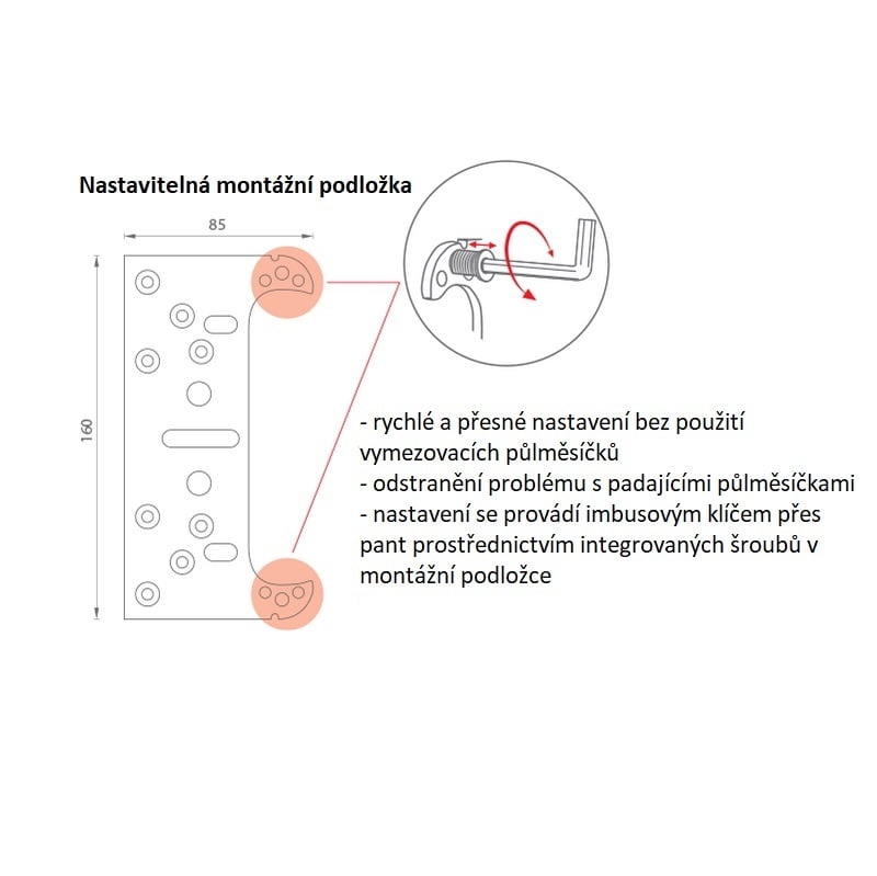 • nastavení se provádí s imbusovým klíčem přes pant prostřednictvím integrovaných šroubů v montážní podložce.