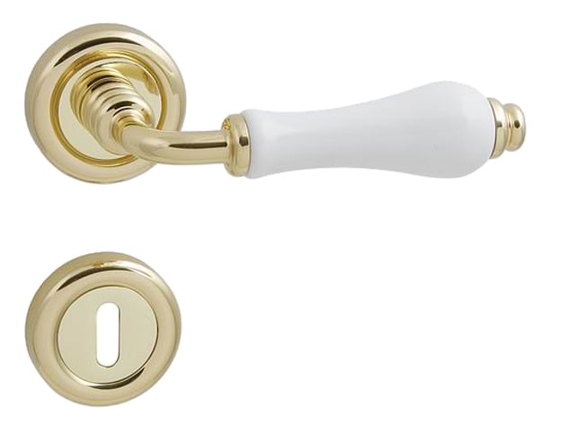 Rozetová klika na interiérové ​​dveře s kulatou rozetou je vyrobena z materiálů vysoké kvality - mosaz a porcelán a je povrchově upravena. Rozeta má průměr 50 mm.