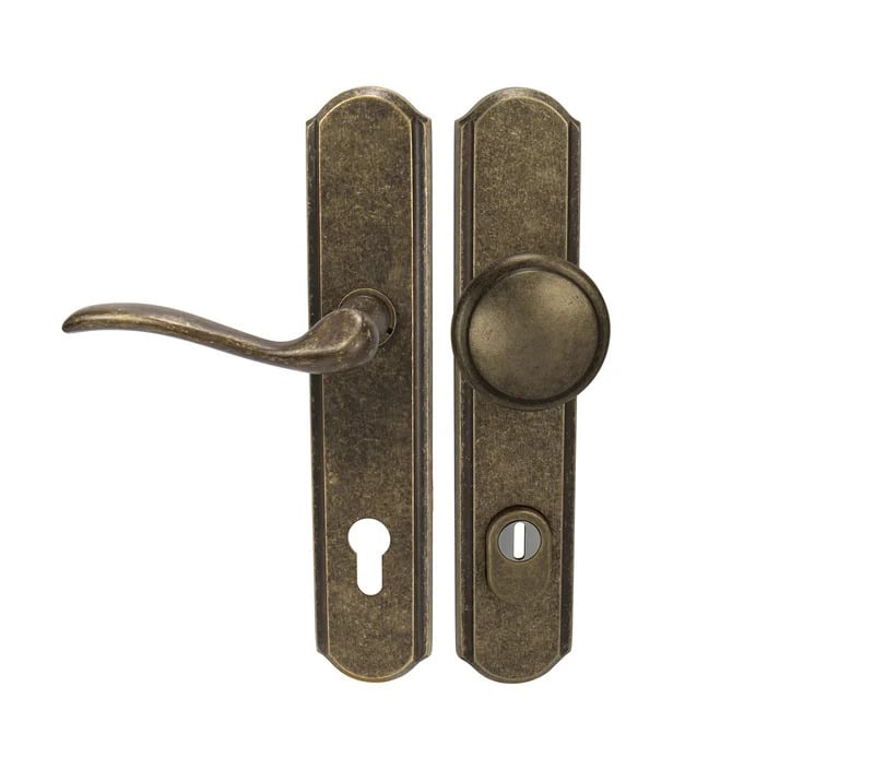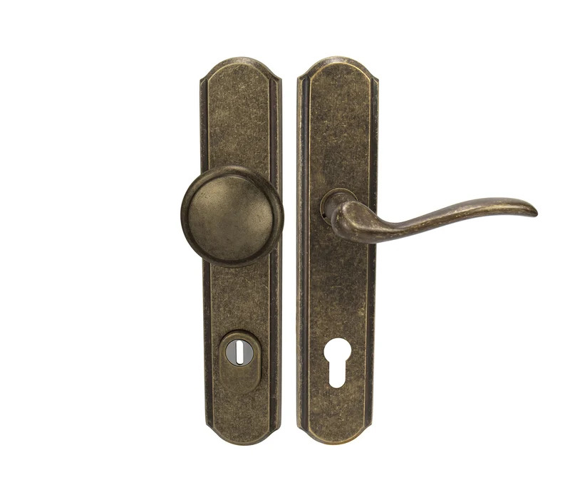 Štítová klika na vchodové a bezpečnostní dveře se zpevněným rustikálním štítem s překrytím cylindrické vložky je vyrobená z materiálů vysoké kvality – mosaz a je povrchově upravená.