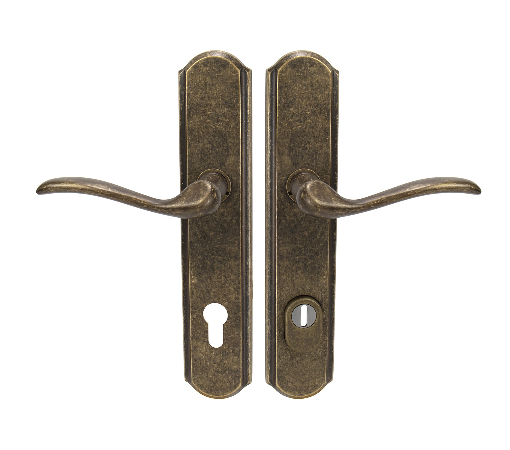 Štítová klika na vchodové a bezpečnostní dveře se zpevněným rustikálním štítem s překrytím cylindrické vložky je vyrobená z materiálů vysoké kvality – mosaz a je povrchově upravená.