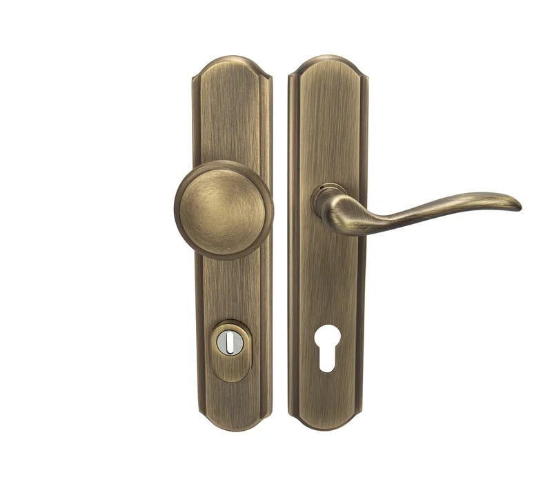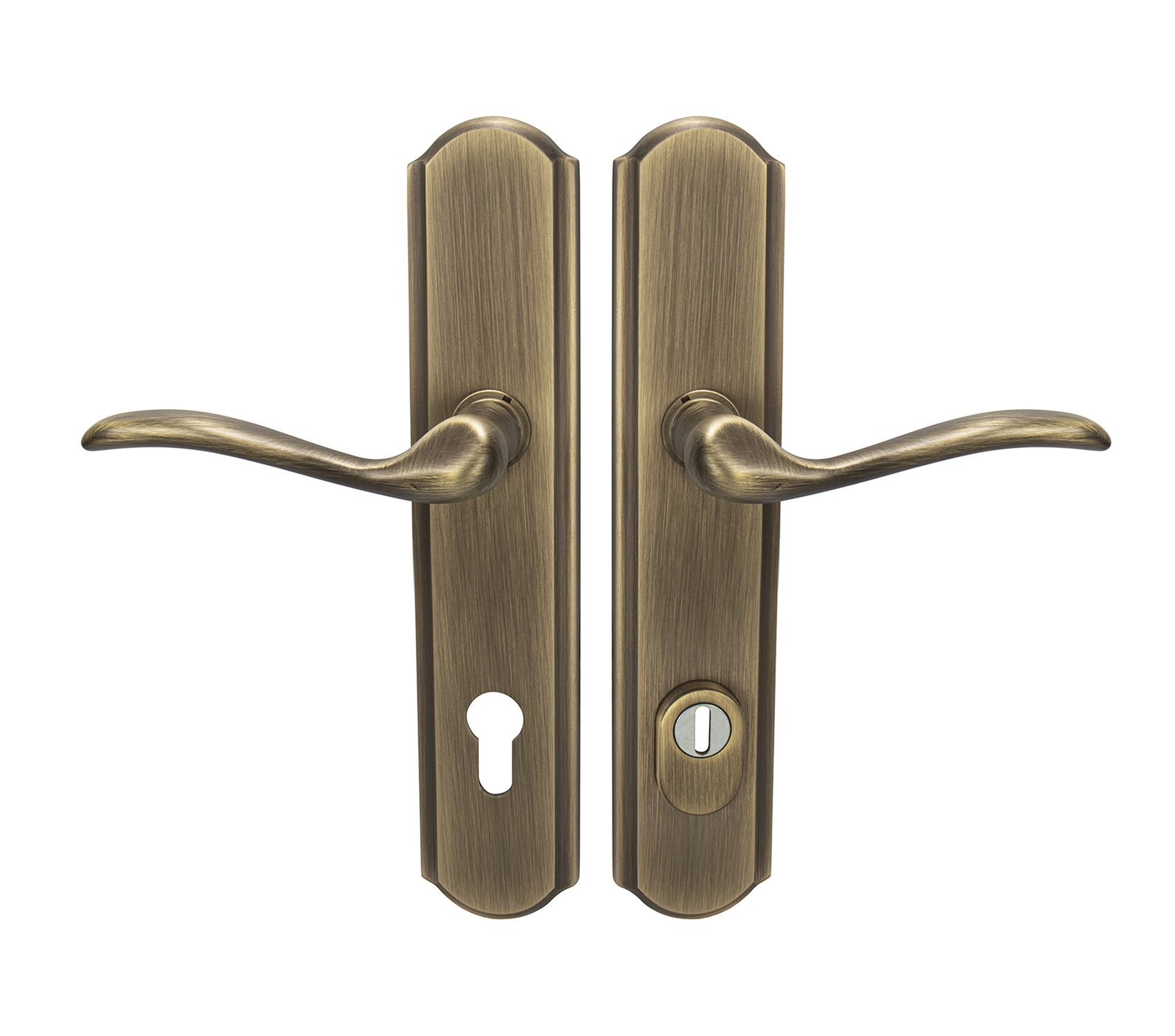 Štítová klika na vchodové a bezpečnostní dveře se zpevněným rustikálním štítem s překrytím cylindrické vložky je vyrobená z materiálů vysoké kvality – mosaz a je povrchově upravená.