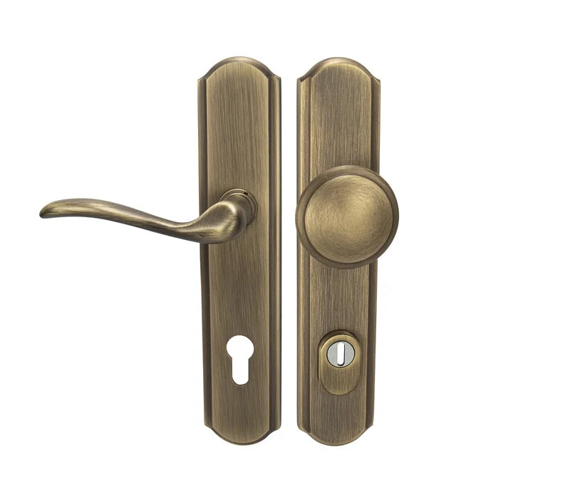 Štítová klika na vchodové a bezpečnostní dveře se zpevněným rustikálním štítem s překrytím cylindrické vložky je vyrobená z materiálů vysoké kvality – mosaz a je povrchově upravená.