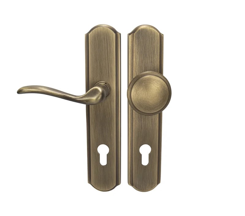 Štítová klika na vchodové a bezpečnostní dveře se zpevněným rustikálním štítem bez překrytí cylindrické vložky je vyrobená z materiálů vysoké kvality – mosaz a je povrchově upravená.