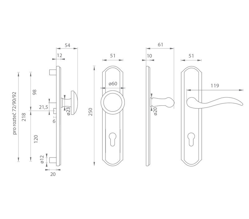 U zpevněného kování je třeba znát vzdálenost mezi osou kliky a osou klíče (rozteč). Standardní vzdálenost je 72, 90 nebo 92 mm. Kování je standardem pro tloušťku dveří od 38 mm do 50 mm.