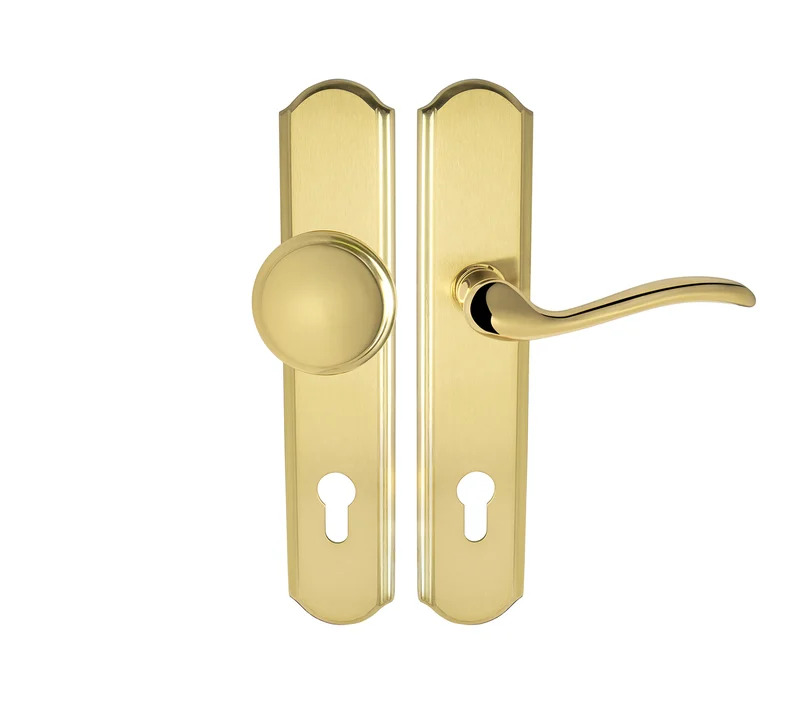 Štítová klika na vchodové a bezpečnostní dveře se zpevněným rustikálním štítem bez překrytí cylindrické vložky je vyrobená z materiálů vysoké kvality – mosaz a je povrchově upravená.