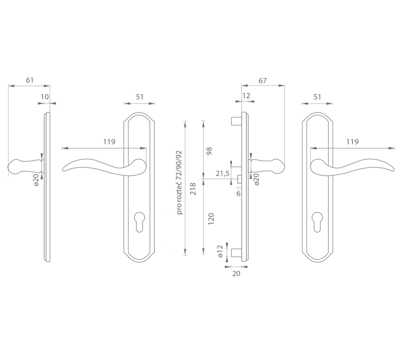 U zpevněného kování je třeba znát vzdálenost mezi osou kliky a osou klíče (rozteč). Standardní vzdálenost je 72, 90 nebo 92 mm. Kování je standardem pro tloušťku dveří od 38 mm do 50 mm.