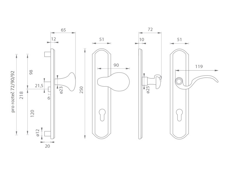 U zpevněného kování je třeba znát vzdálenost mezi osou kliky a osou klíče (rozteč). Standardní vzdálenost je 72, 90 nebo 92 mm. Kování je standardem pro tloušťku dveří od 38 mm do 50 mm.