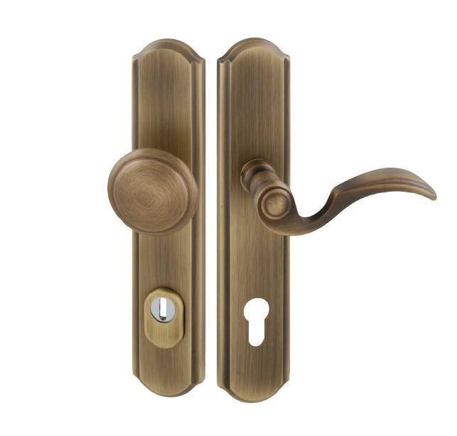 Štítová klika na vchodové a bezpečnostní dveře se zpevněným rustikálním štítem s překrytím cylindrické vložky je vyrobena z materiálů vysoké kvality - mosaz a je povrchově upravena. Rustikální štít má rozměry 51 mm x 250 mm a tloušťku 12 mm.