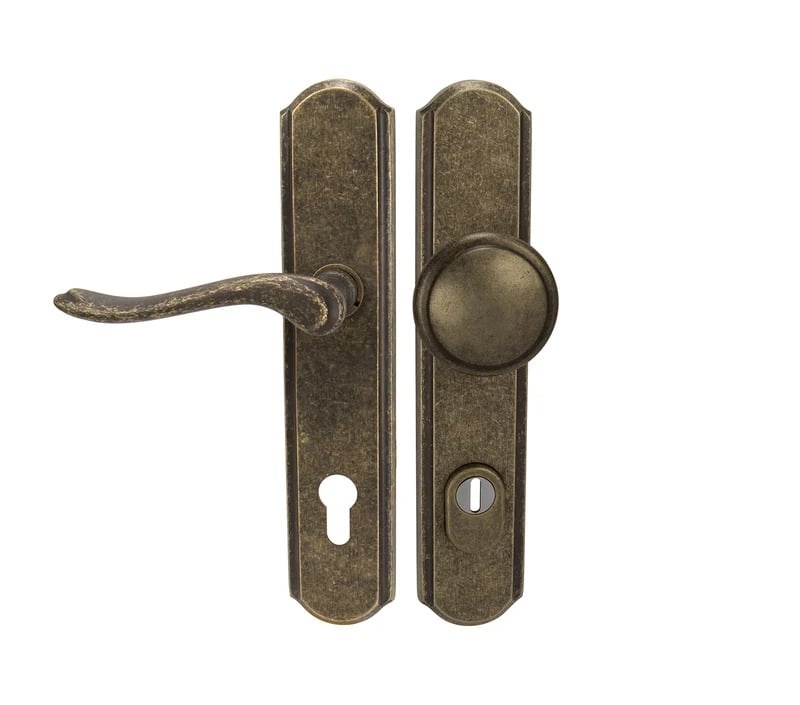 Štítová klika na vchodové a bezpečnostní dveře se zpevněným rustikálním štítem s překrytím cylindrické vložky je vyrobená z materiálů vysoké kvality – mosaz a je povrchově upravená.