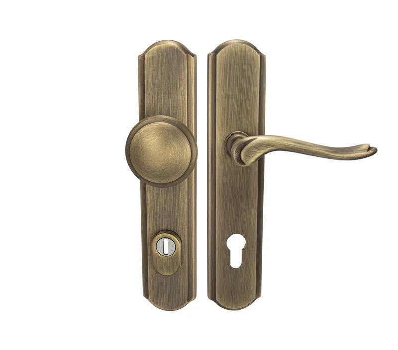 Štítová klika na vchodové a bezpečnostní dveře se zpevněným rustikálním štítem s překrytím cylindrické vložky je vyrobená z materiálů vysoké kvality – mosaz a je povrchově upravená.