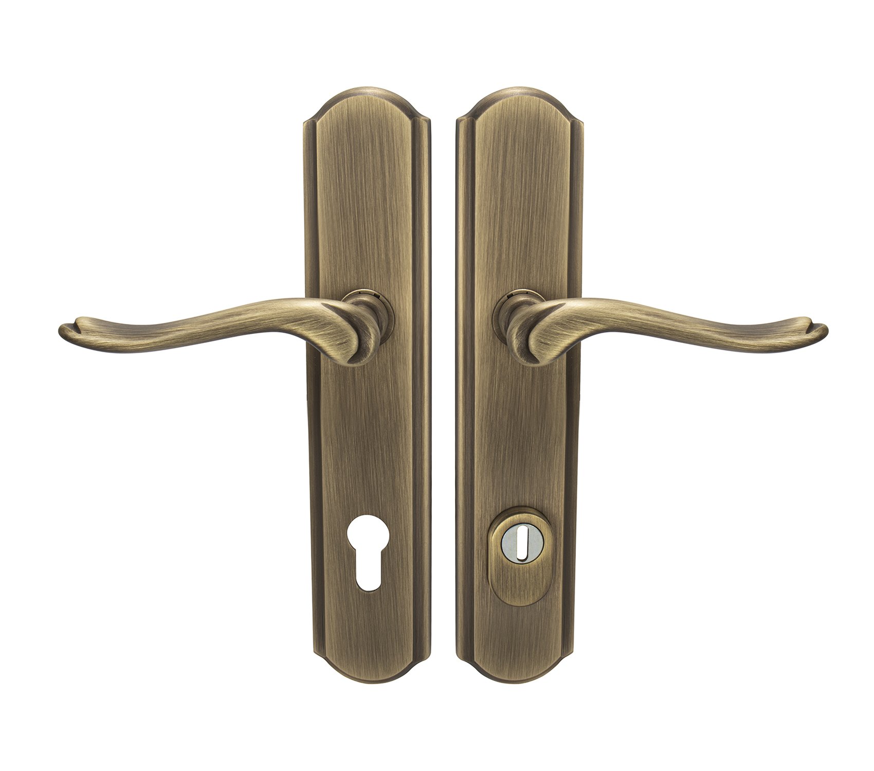 Štítová klika na vchodové a bezpečnostní dveře se zpevněným rustikálním štítem s překrytím cylindrické vložky je vyrobená z materiálů vysoké kvality – mosaz a je povrchově upravená.