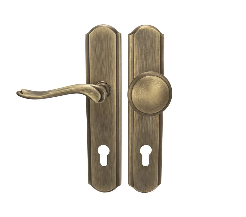 Štítová klika na vchodové a bezpečnostní dveře se zpevněným rustikálním štítem bez překrytí cylindrické vložky je vyrobená z materiálů vysoké kvality – mosaz a je povrchově upravená.