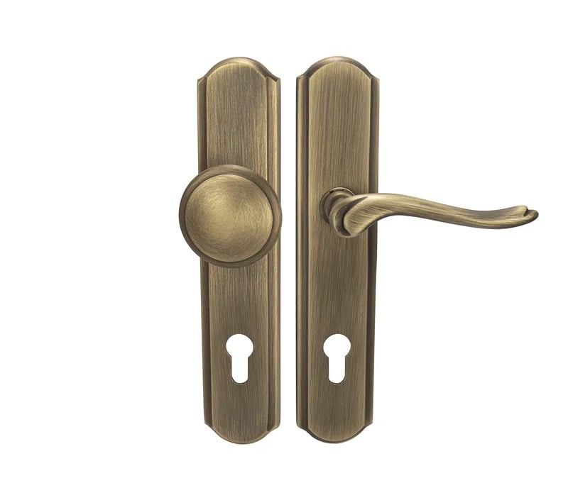 Štítová klika na vchodové a bezpečnostní dveře se zpevněným rustikálním štítem bez překrytí cylindrické vložky je vyrobená z materiálů vysoké kvality – mosaz a je povrchově upravená.