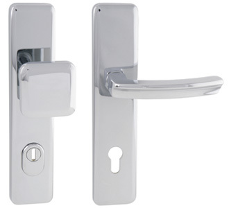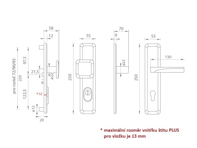 Štítová klika na vchodové a bezpečnostní dveře se zpevněným hranatým štítem s překrytím cylindrické vložky je vyrobena z materiálů vysoké kvality - mosaz a je povrchově upravena. Hranatý štít má rozměry 55 mm x 250 mm a tloušťku 12 mm.