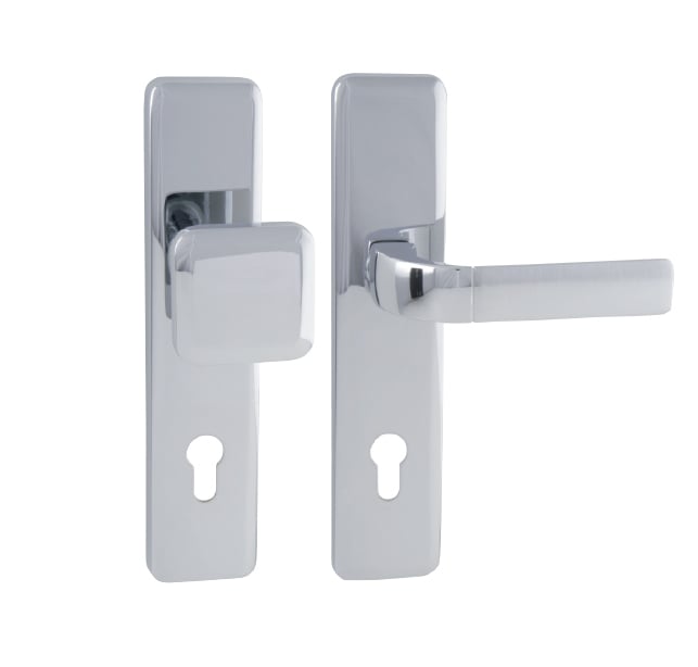 Štítová klika na vchodové a bezpečnostní dveře se zpevněným hranatým štítem bez překrytí cylindrické vložky je vyrobena z materiálů vysoké kvality - mosaz a je povrchově upravena. Hranatý štít má rozměry 55 mm x 250 mm a tloušťku 12 mm.