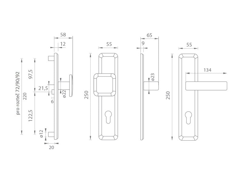 Štítová klika na vchodové a bezpečnostní dveře se zpevněným hranatým štítem bez překrytí cylindrické vložky je vyrobena z materiálů vysoké kvality - mosaz a je povrchově upravena. Hranatý štít má rozměry 55 mm x 250 mm a tloušťku 12 mm.