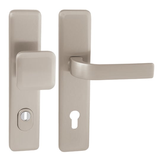 Štítová klika na vchodové a bezpečnostní dveře se zpevněným hranatým štítem s překrytím cylindrické vložky je vyrobena z materiálů vysoké kvality - mosaz a je povrchově upravena. Hranatý štít má rozměry 55 mm x 250 mm a tloušťku 12 mm.