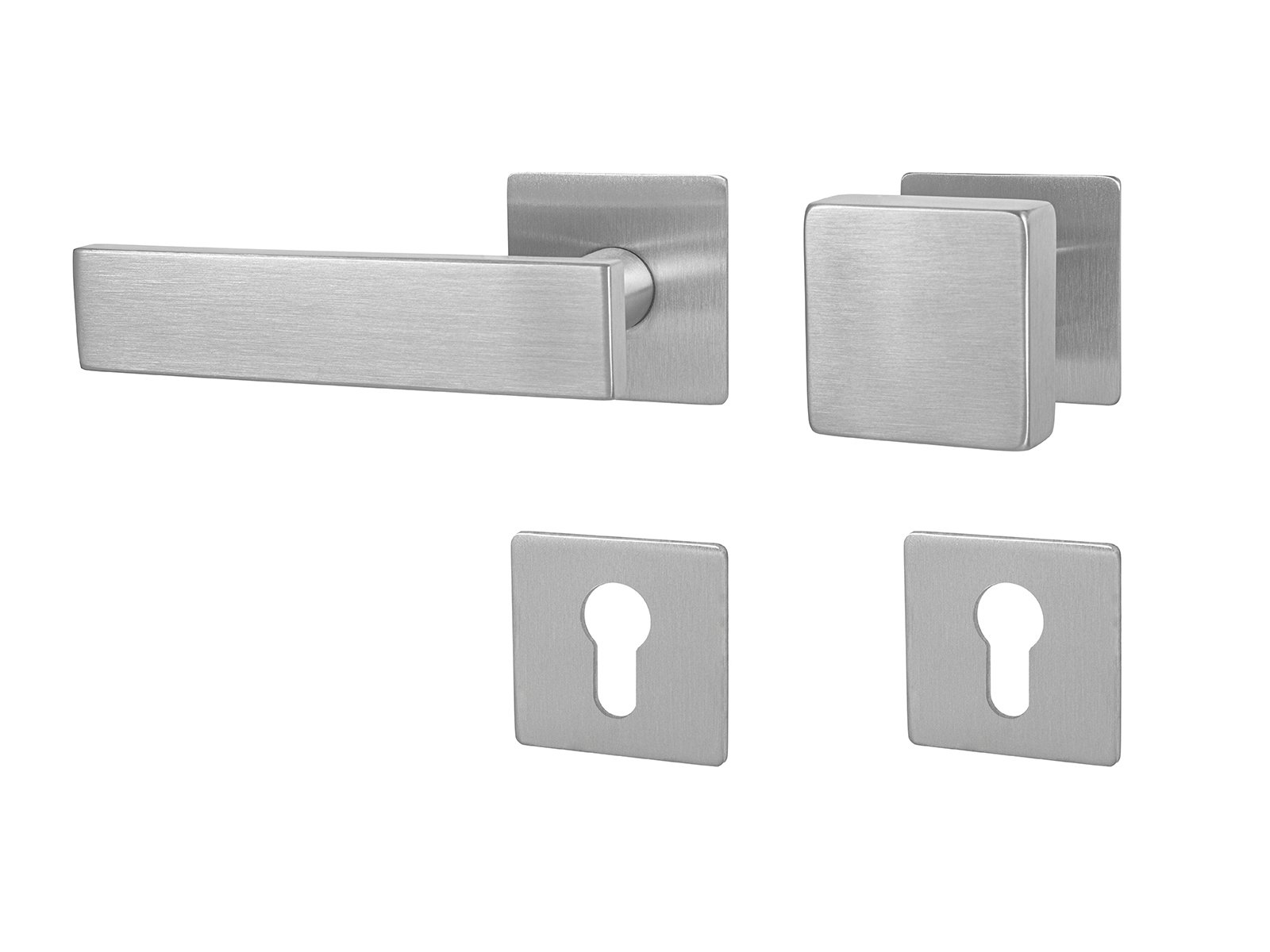 Rozetová klika na interiérové ​​dveře s magnetickou plochou hranatou rozetou je vyrobena z vysoce kvalitní nerezavějící oceli, známé jako nerez a je povrchově upravena. Rozeta má rozměry 55 mm x 55 mm a tloušťku jen 3 mm. Je barevně stabilní a odolná vůči opotřebení. Kování je testováno podle normy EN 1906 na 200 000 cyklů.