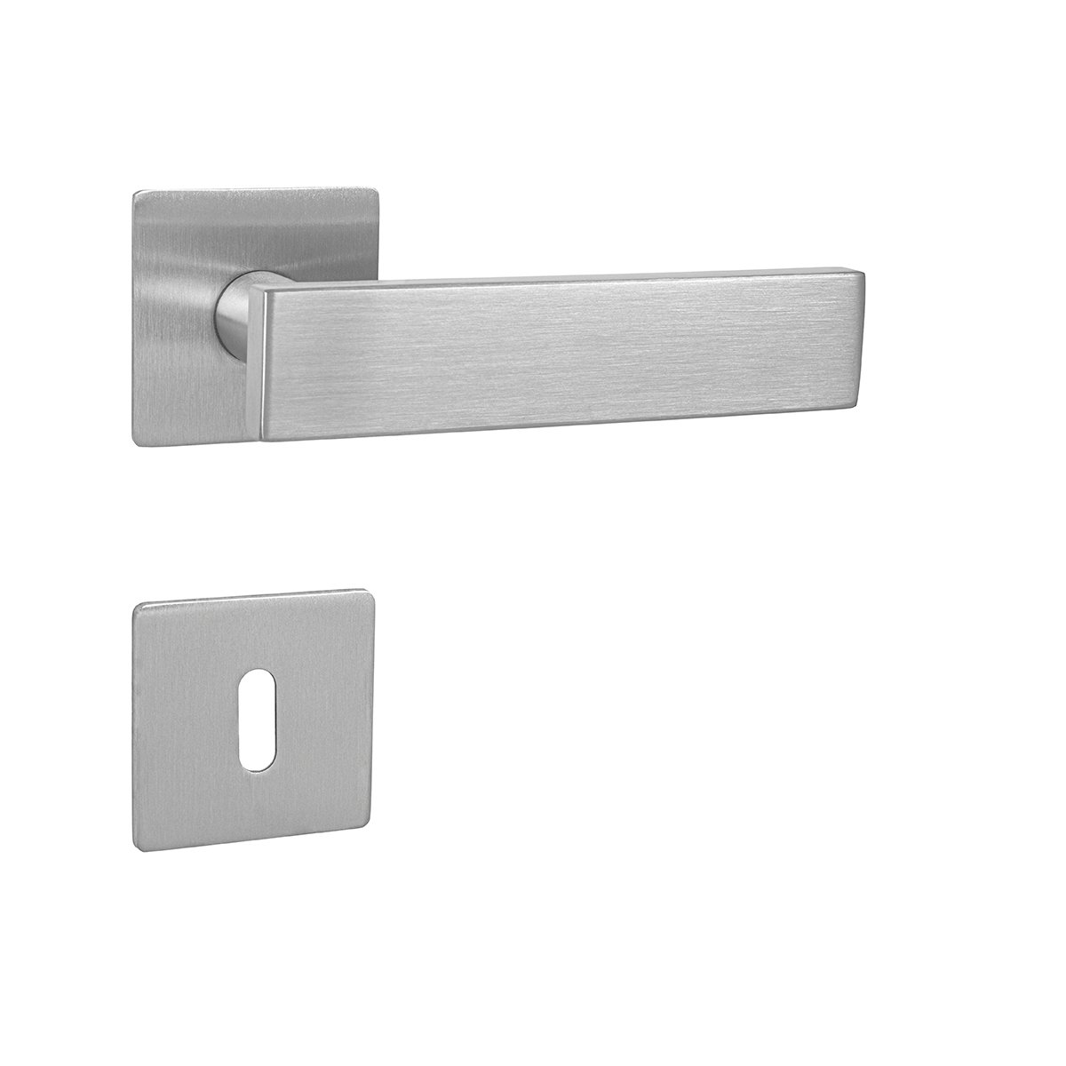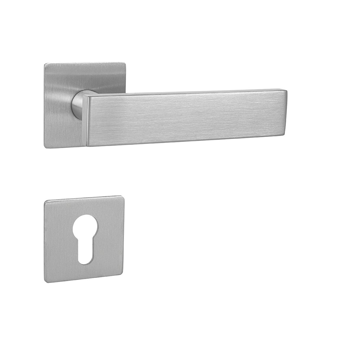 Rozetová klika na interiérové ​​dveře s magnetickou plochou hranatou rozetou je vyrobena z vysoce kvalitní nerezavějící oceli, známé jako nerez a je povrchově upravena. Rozeta má rozměry 55 mm x 55 mm a tloušťku jen 3 mm. Je barevně stabilní a odolná vůči opotřebení. Kování je testováno podle normy EN 1906 na 200 000 cyklů.