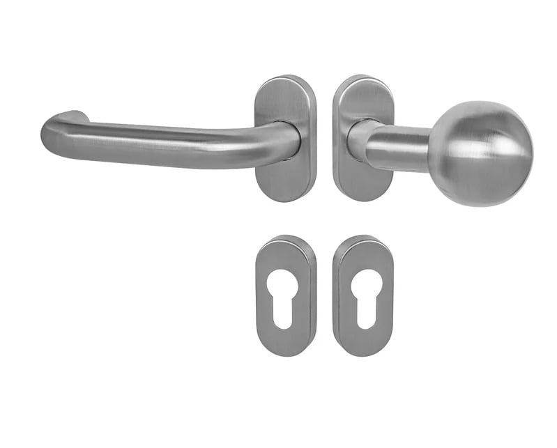 Rozetová klika s oválnou úzkou rozetou pro dveře s úzkým profilem (např.: zahradní branky a branky plotů) je vyrobena z vysoce kvalitní nerezavějící oceli, známé jako nerez a je povrchově upravena. Mechanismus kliky obsahuje vratnou pružinu.
