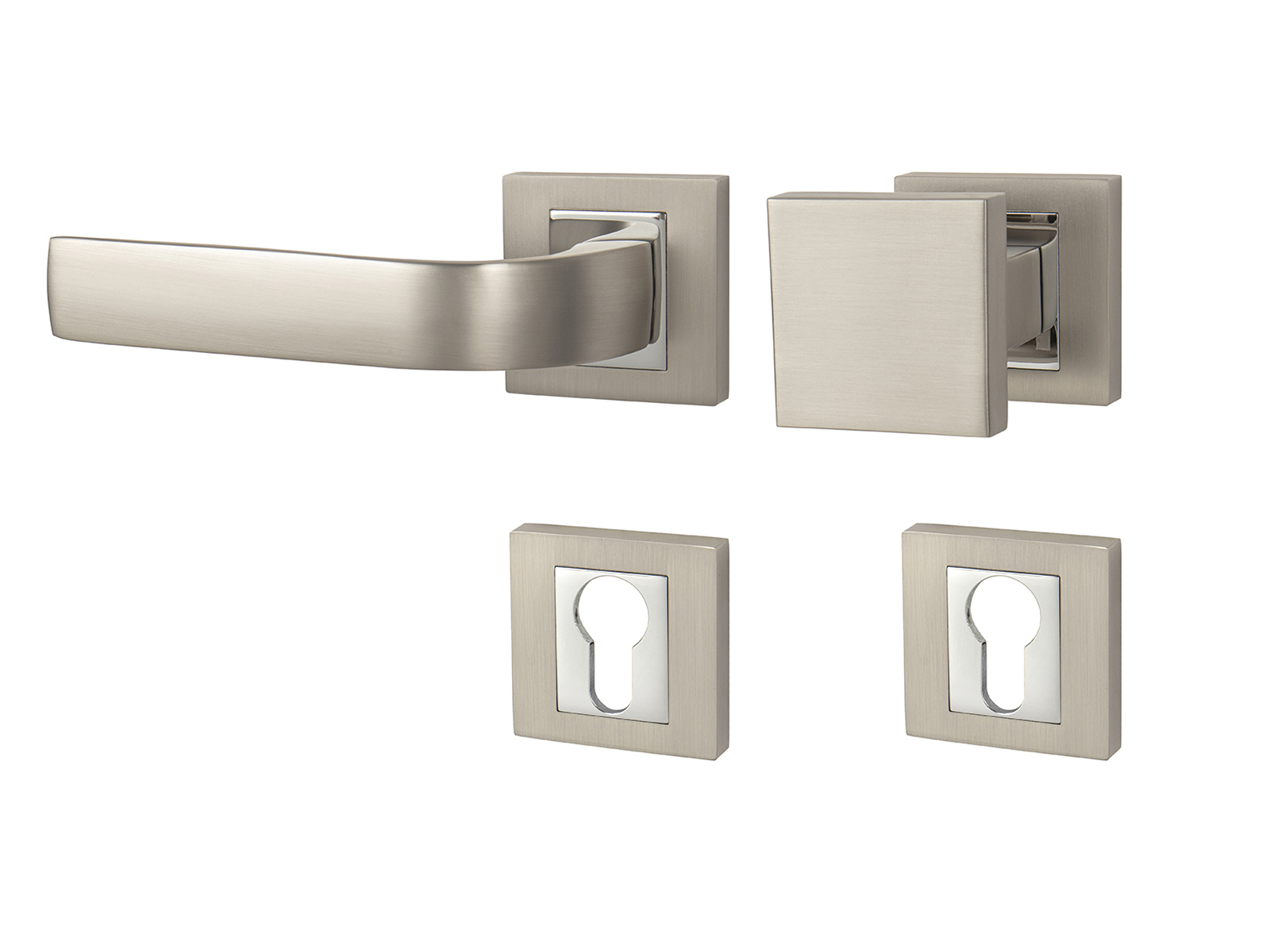 Rozetová klika na interiérové ​​dveře s hranatou rozetou je vyrobena odléváním z kvalitních slitin zinku a hliníku a je povrchově upravena. Rozeta má rozměry 52 mm x 52 mm a tloušťku 10 mm. Klika je povrchově upravována galvanizací a vyznačuje se vysokou odolností proti korozi. Kování je testováno na 100 000 cyklů.