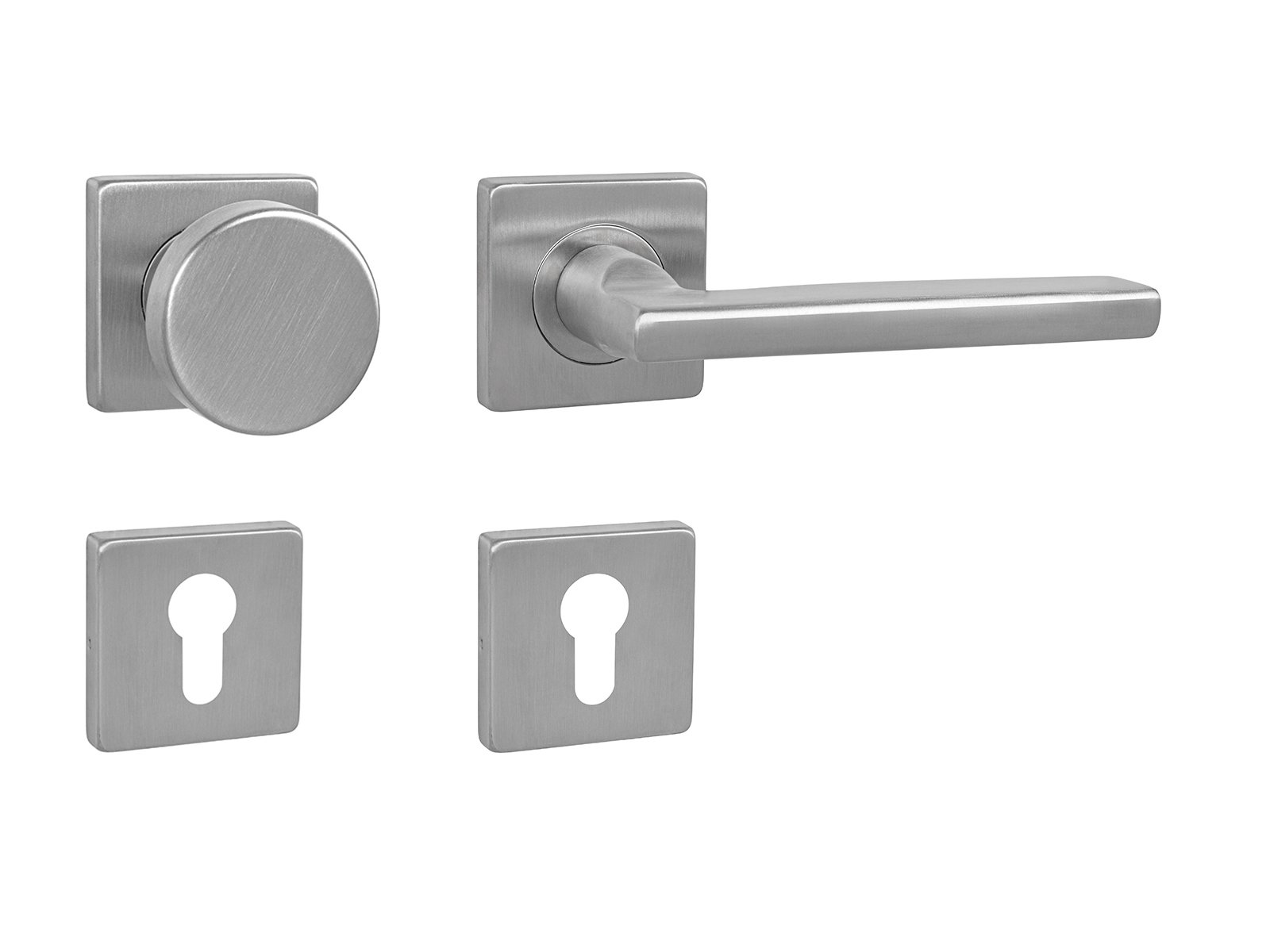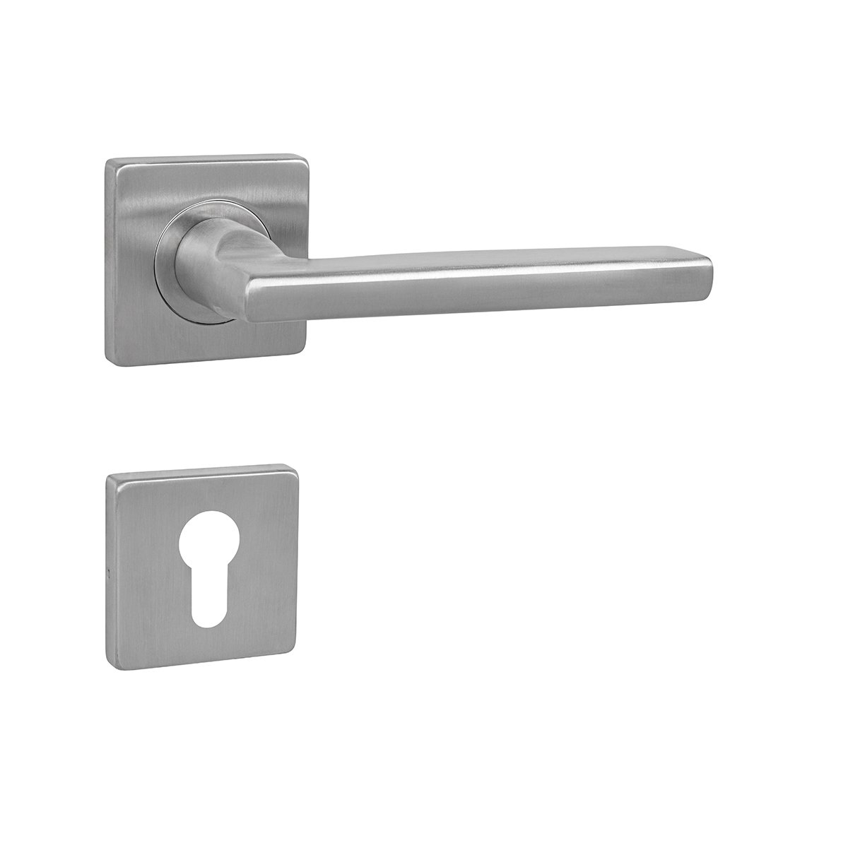 Rozetová klika na interiérové dveře s hranatou rozetou je vyrobená z vysoce kvalitní nerezavějící oceli, známé jako nerez a je povrchově upravená. Rozeta má rozměry 54 mm x 54 mm a tloušťku 9 mm. Je barevně stabilní a odolná vůči opotřebení. Kování je testované podle normy ČSN EN 1906:2012 na 200 000 cyklů.