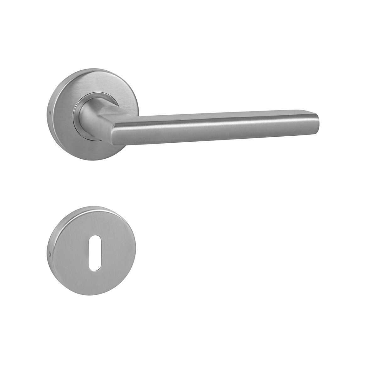 Rozetová klika na interiérové ​​dveře s kulatou rozetou z kvalitní nerezavějící oceli, známé jako nerez a je povrchově upravena. Rozeta má průměr 54 mm a tloušťku 9 mm. Je barevně stabilní a odolná vůči opotřebení. Kování je testováno dle normy ČSN EN 1906: 2012 na 200 000 cyklů.