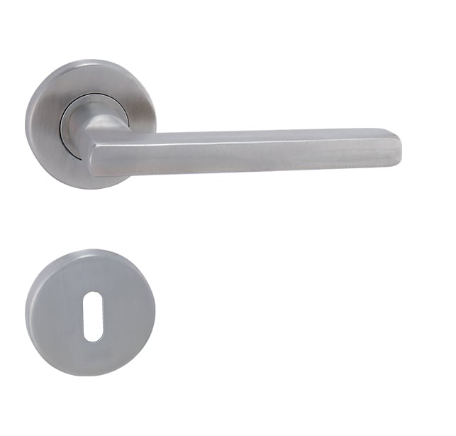 Rozetová klika na interiérové ​​dveře s kulatou rozetou z kvalitní nerezavějící oceli, známé jako nerez a je povrchově upravena. Rozeta má průměr 54 mm a tloušťku 9 mm. Je barevně stabilní a odolná vůči opotřebení. Kování je testováno dle normy ČSN EN 1906: 2012 na 200 000 cyklů.